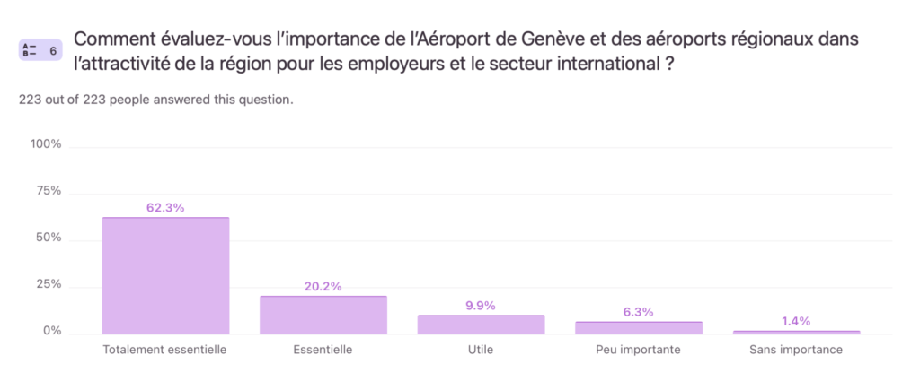 Une fois ce contexte établi, le cœur de sondage visait à mesurer l’importance concrète des différents éléments constitutifs de l’infrastructure aéroportuaire ainsi que de la desserte aérienne. En tant que principal aéroport de Romandie, Genève Aéroport est considéré par 82,5 % des répondants comme un atout majeur pour l’attractivité régionale. À l’inverse, seuls 3 répondants sur 223 (1,3 %) considèrent que cette infrastructure n’a aucune importance pour l’attractivité de notre région.